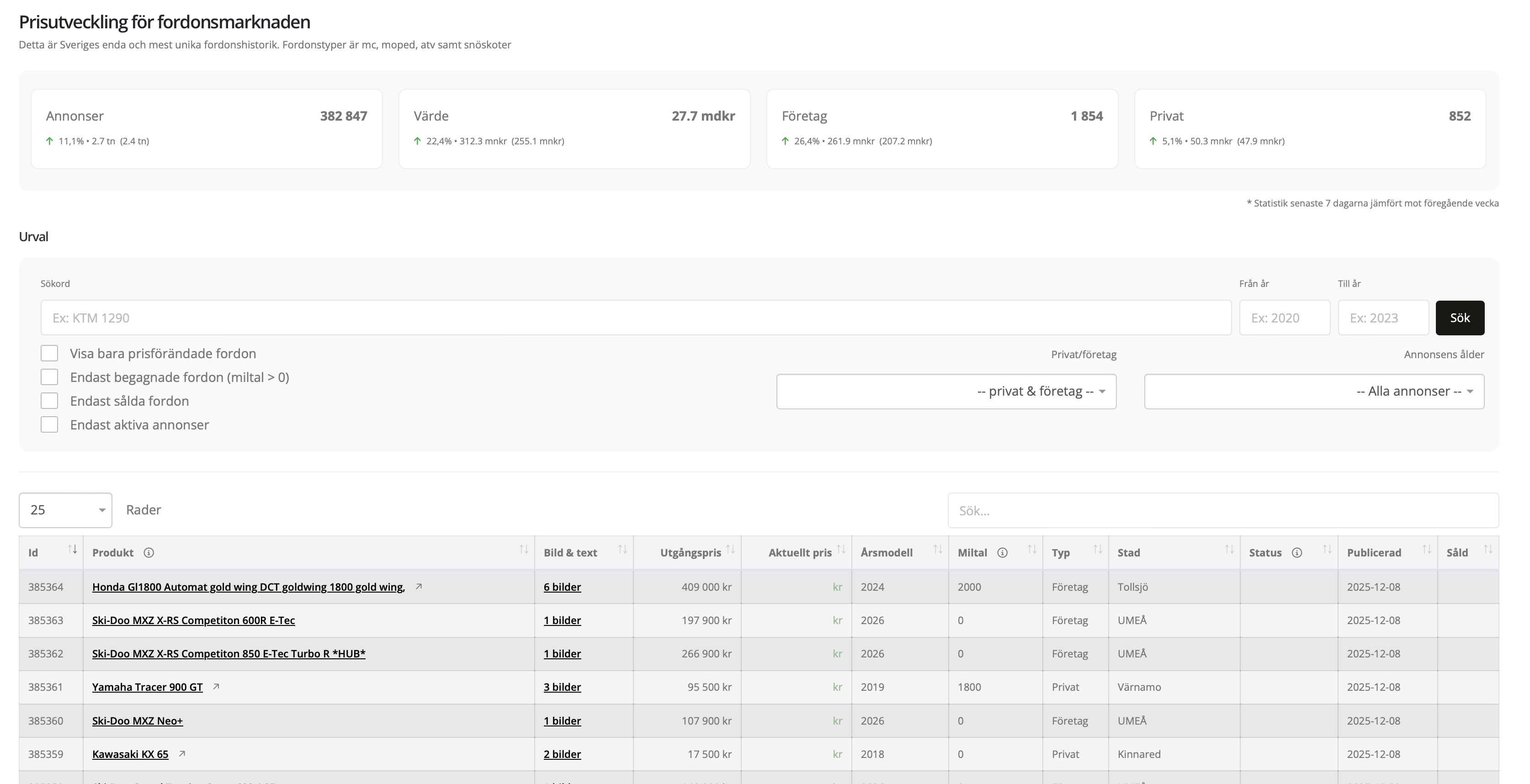 För dig som är intresserad att se prishistorik med snart 400.000 annonser för motorcyklar sedan 2021 kan här söka fram och se ungefär hur mycket ett utgångspris har varit på en specifik modell. Detta är värdefullt att använda vid såväl inbyte, som värdering och prissättning. Tjänsten är tillgänglig för alla användare kopplade till företaget som beställer tjänster.