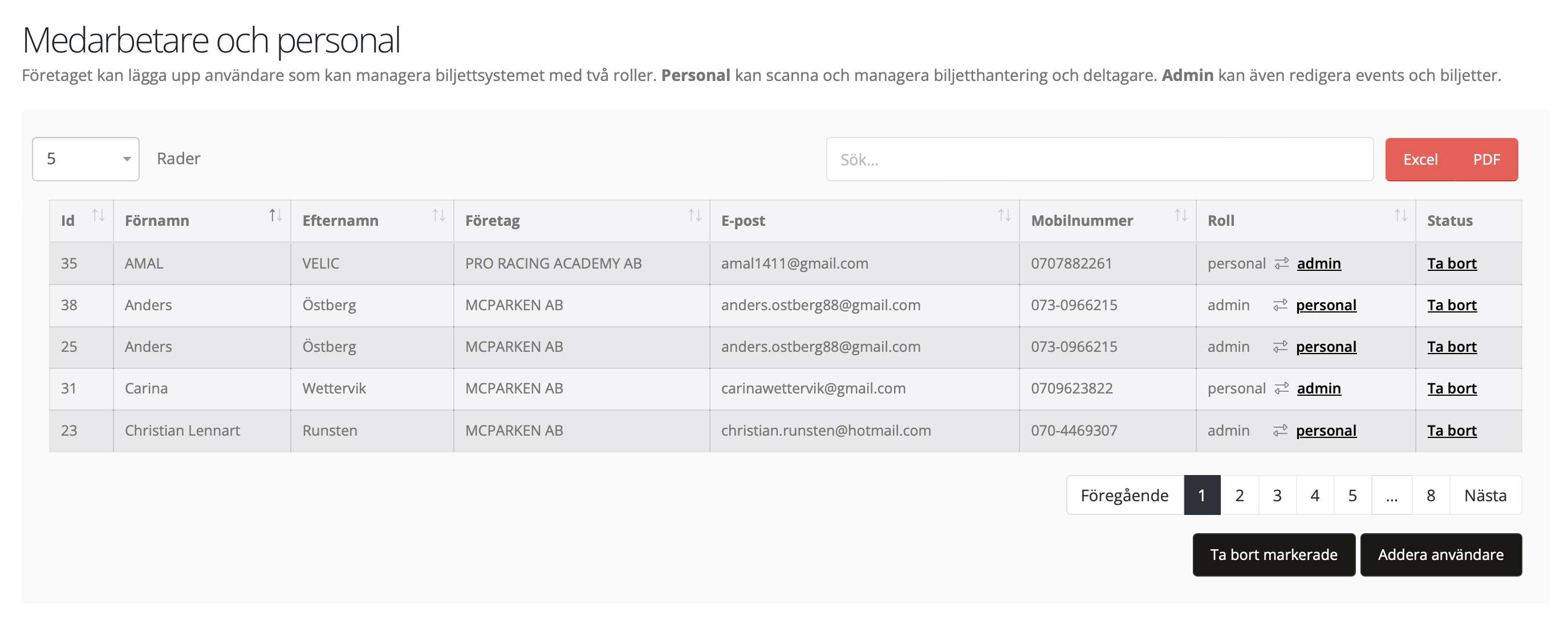 Genom att klicka till höger i listan "Ta bort", så tas användaren bort som personal eller administratör för företagets biljetter. Du kan givetvis addera den igen