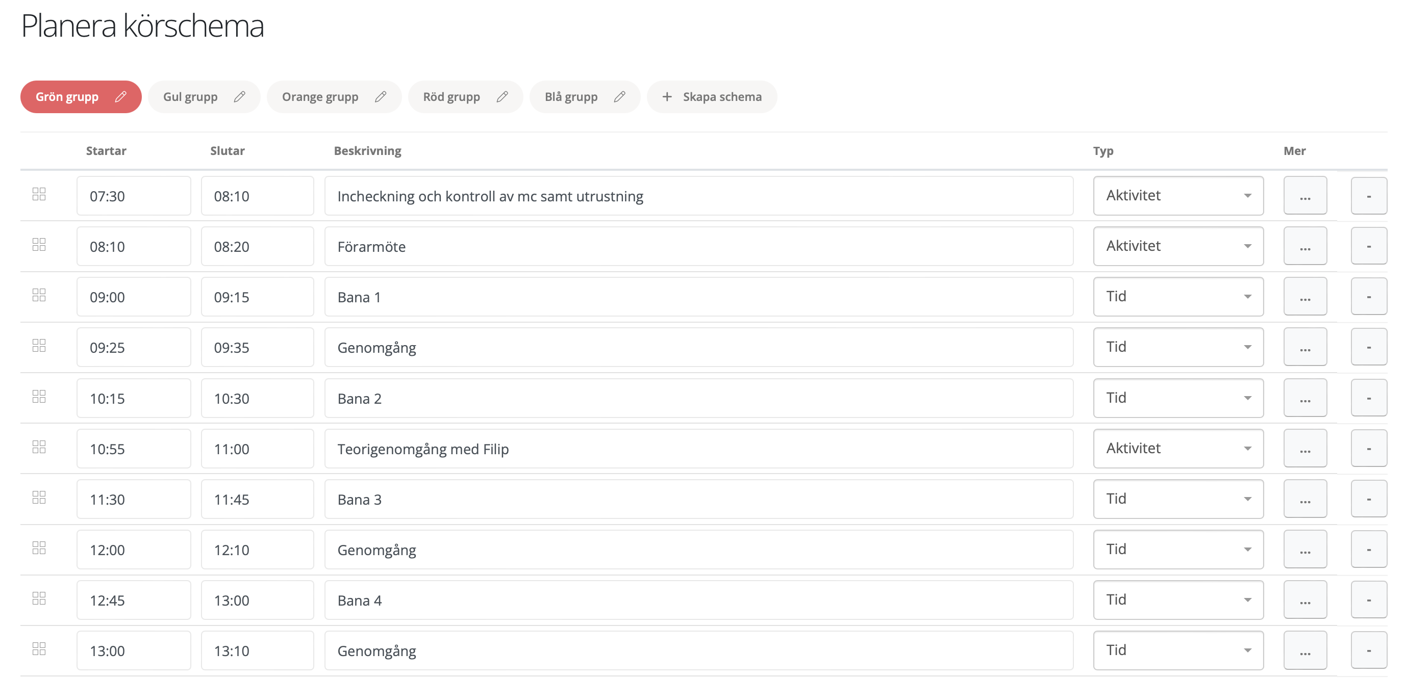 Överst finns knappen "Skapa schema". Klicka där för att skapa och namnge ett schema. När du skapat schemat kan du ändra namnet genom att klicka på penn-ikonen. Du kan radera ett schema med knappen längst ner "radera". Om du raderar ett schema så tas alla rader bort och kan inte återskapas, då får du skapa om det.