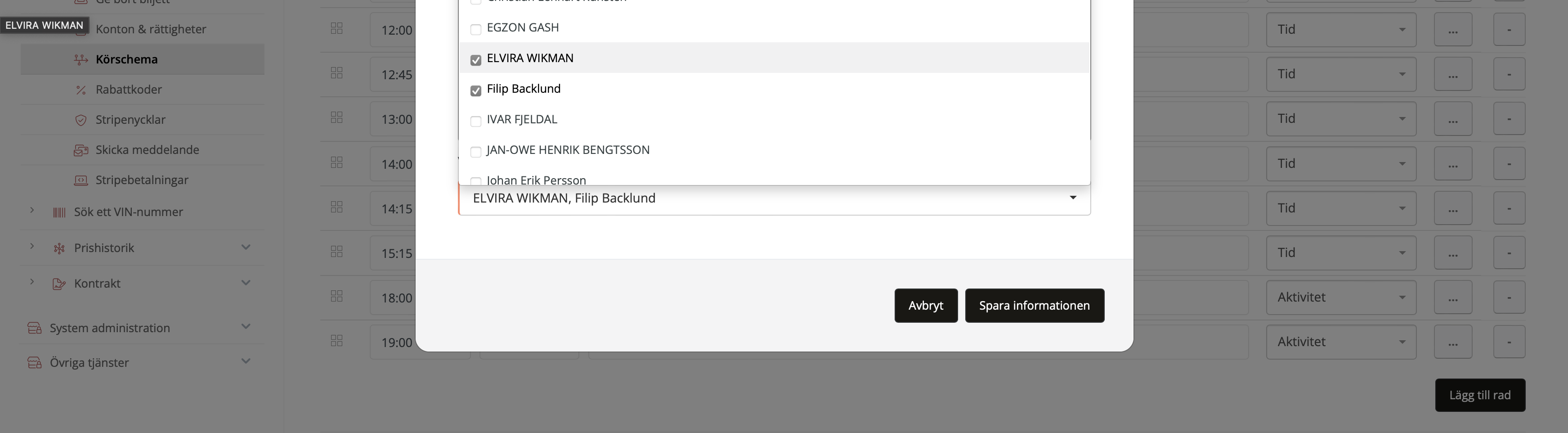 I dropdown-listan visas alla personer som är inlagda som personal eller administratörer. Här kan du välja en eller flera personer som förväntas ansvara för respektive aktivitet. På så sätt kan du till och med planera in vem eller vilka personer som skall vara instruktörer och köra tillsammans med denna grupp. Har du fyllt i denna informationen så ser även kunden vilken eller vilka instruktörer som kör med de- på så sätt kan man lättare komma ihåg namnet på instruktören. Likaså kan instruktören se vilka personers namn som kör det aktuella eventet.