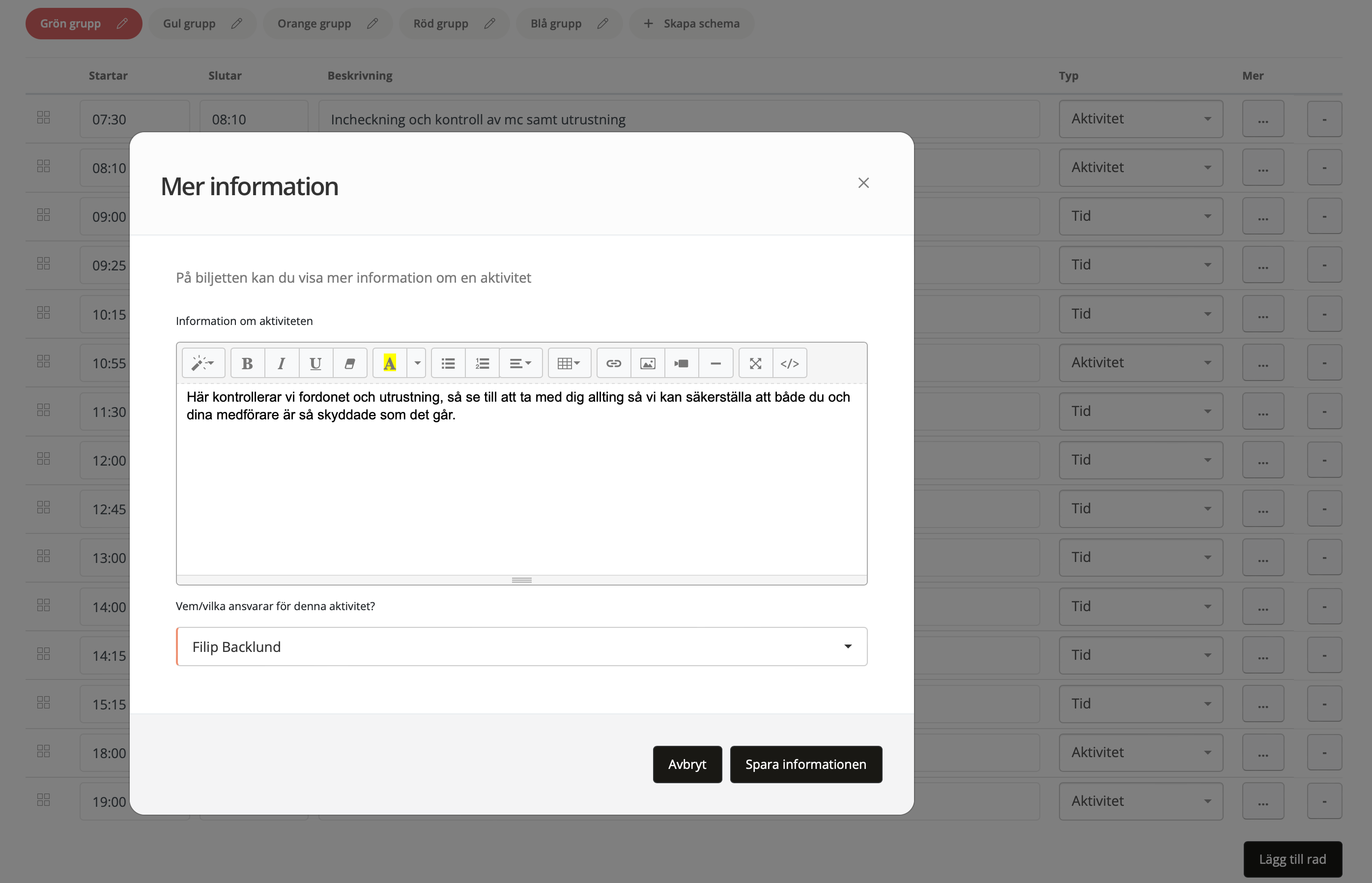 Du kan redigera alla fält, startar, slutar, beskrivning, typ av aktivitet och trycka på knappen mer för att lägga till informationstext samt vem som ansvarar för aktiviteten av personalen. När du har redigerat informationen, glöm inte att längst ner trycka på "uppdatera" för att spara de ändringar du gjort.