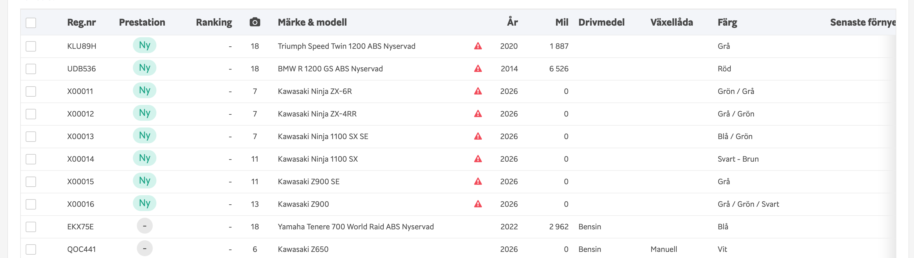 Obs! De annonser som ni skapat via mcparken bör också redigeras och stängas här. Annonser som skapats på Blocket ska fortsatt uppdateras och hanteras via beta.bytbil. Ni ser att de annonser som är skapade på Blocket har en varningstriangel på Bytbil. På så sätt ser ni skillnad på annonser. (Varningen är egentligen att drivmedel saknas, vilket de inte erbjuder att skicka med än).