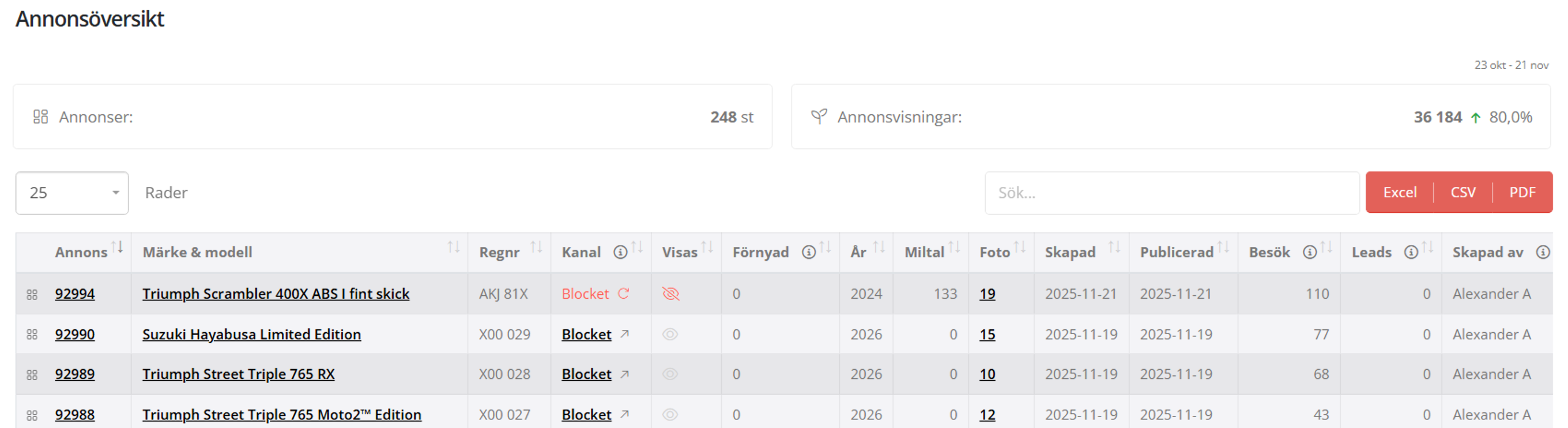 Genom att titta på annons-översikten så kan du se om annonsen på mcparken inte kan hittas på Blocket. Detta syns genom att fältet Kanal har rödmarkerad text och vi försöker hitta annonsen på Blocket utan resultat. På så sätt ser du att annonsen på blocket och mcparken inte är kopplade till varandra.
